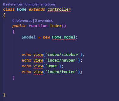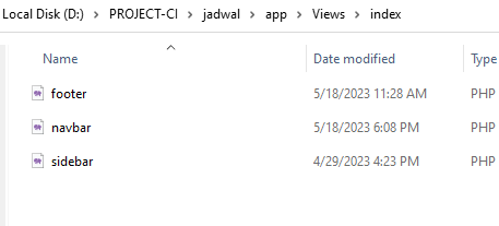 sekarang bagaimana cara manggilnya di controller. di setiap template pasti akan ada file index, file index ini lah yang akan kita pecah pecah jadi 3 bagian. Navbar, sidebar dan footer, kemudian simpan dalam sebuah folder di views. DI contoh ini aku simpan dalam sebuah folder index